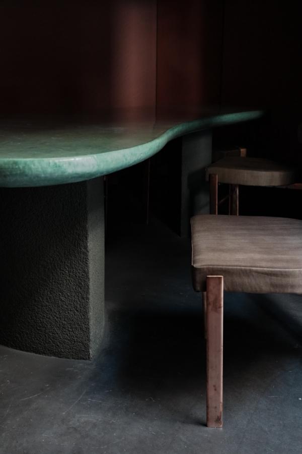 家具:テーブル/シナランバー下地3層石灰クリーム磨き仕上げ イス/金属部・ST+銅パイプたたき仕上げ 座面、背・高圧ウレタン+布張り(YANTOR)