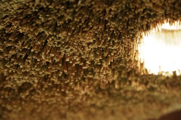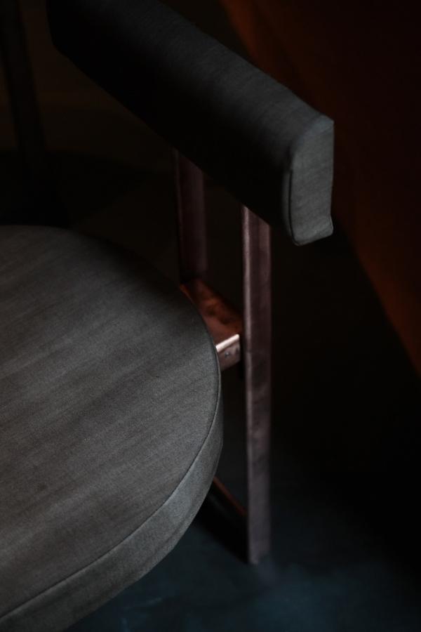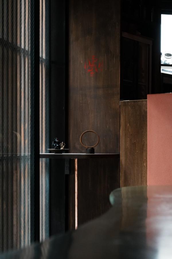 私が施したのは、この船とオーナーの空気感を重ね合わせることだった。大地を感じる土、食の源である稲藁、自然な風化を楽しめる銅、重厚かつ柔らかさのある木材を用い、空間の各部を構成した。木格子で雑踏から遮られたこの小さな船は、躍動感のある線状の掻き落としの土壁で囲まれ、中心には茅の屋根(シェード)と左官のテーブルが配置されている。ネパールで自然に扱われるピンクと緑の二色の左官仕上げに表情の変化をつけ、独特の柔らかさを生み出す。手触りの良い銅のフレームで構成されたイスは、YANTORの生地が滑らかで心地良い。卓越した職人によるこれらの素材が際立つ手仕事は、ADIの理念と重なり合う。
